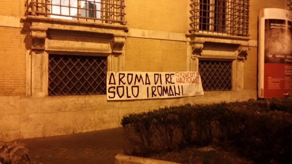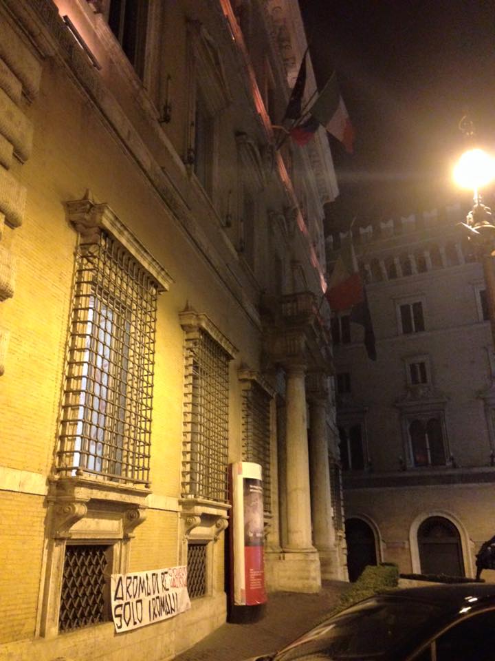 Blitz di Gioventù Nazionale, movimento giovanile di Fratelli d’Italia, davanti alla sede della Prefettura di Roma dopo il caso dei funerali-show di Vittorio Casamonica. Questa notte i militanti e i simpatizzanti del movimento hanno esposto vicino all’ingresso di Palazzo Valentini lo striscione: «A Roma di Re solo i romani».